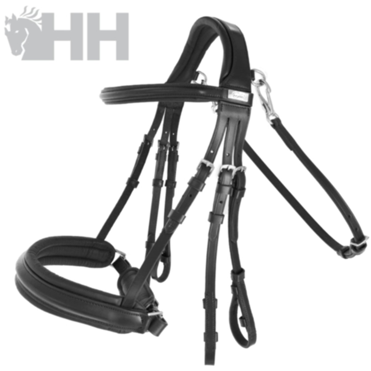 Detalhes técnicos: - Cabeceira acolchoada e com formato anatômico. - Focinheira larga e resistente à pressão. - Testa lateral elástica para melhor ajuste do freio ou do bridão. - Coleira estranguladora removível com mosquetões.