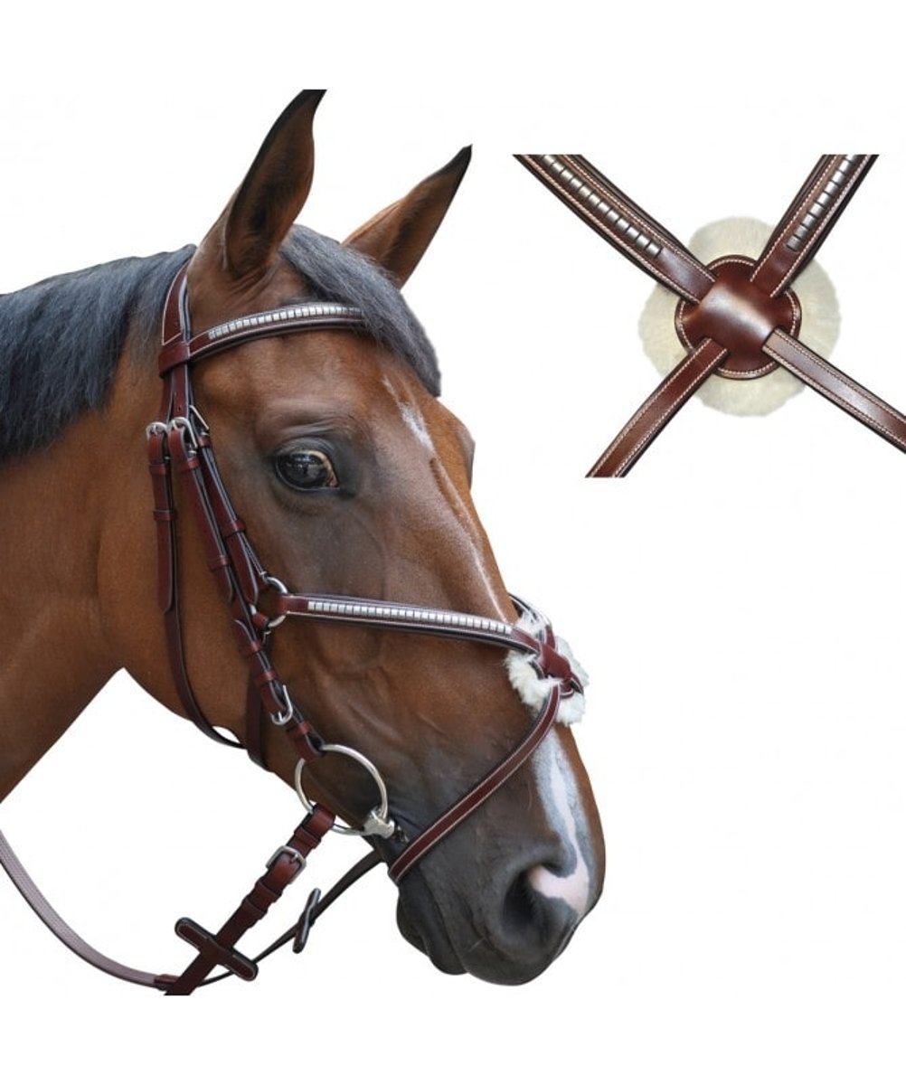 Fabricada em couro de alta qualidade, apresenta um acabamento cuidado com costuras reforçadas e ferragens resistentes, garantindo durabilidade e um visual profissional. A estrutura cruzada ajuda a distribuir melhor a pressão e evita que o cavalo abra excessivamente a boca, promovendo uma resposta mais equilibrada à embocadura.