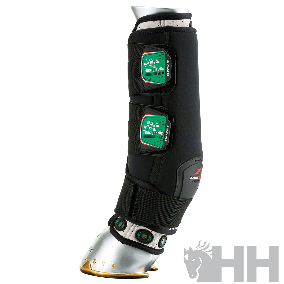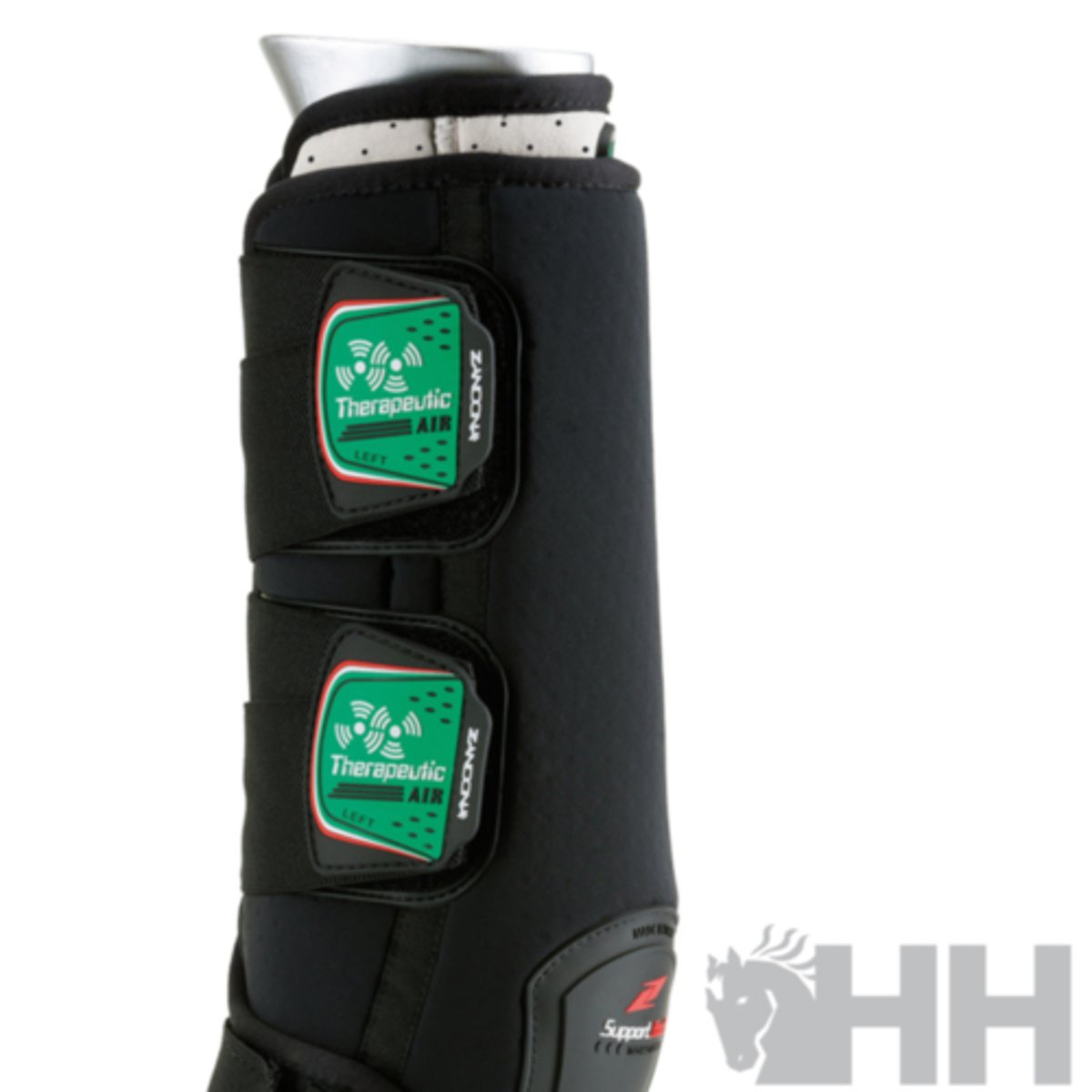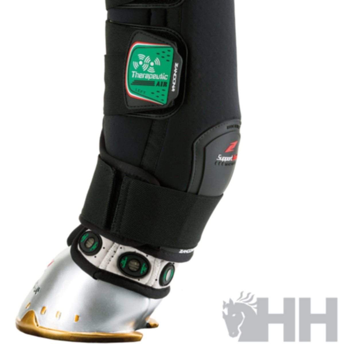 Equipado com 18 dispositivos magnéticos que melhoram a função celular, proporcionando suporte terapêutico natural do casco à canela e, por meio da reflexologia, para todo o corpo. São dois produtos em um, pois também foram desenvolvidos para dar suporte aos ligamentos suspensores e conter o aparelho tendinoso, para uso durante o transporte de cavalos e para reduzir o inchaço típico pós-trabalho. São 100% fabricados na Itália e equipados com uma faixa interna intercambiável com COOLMAX® (uma fibra especial que absorve a umidade para a superfície externa do tecido, mantendo a pele seca). Proteção adicional é fornecida na superfície externa para reduzir o desgaste por atrito. As tiras elásticas com fecho de velcro são calibradas para otimizar o suporte do tendão, garantindo conforto e aderência.Os ímãs permanentes utilizados são compostos por uma liga altamente magnética de neodímio, ferro e boro com revestimento de níquel, cada um capaz de exercer uma densidade de fluxo magnético de 2.600 Gauss. O arranjo específico dos ímãs, sua densidade de fluxo, intensidade e polarização foram estudados com a ajuda de veterinários e cavaleiros profissionais para maximizar o aumento localizado do fluxo sanguíneo vascular e da circulação linfática, com múltiplos efeitos benéficos.