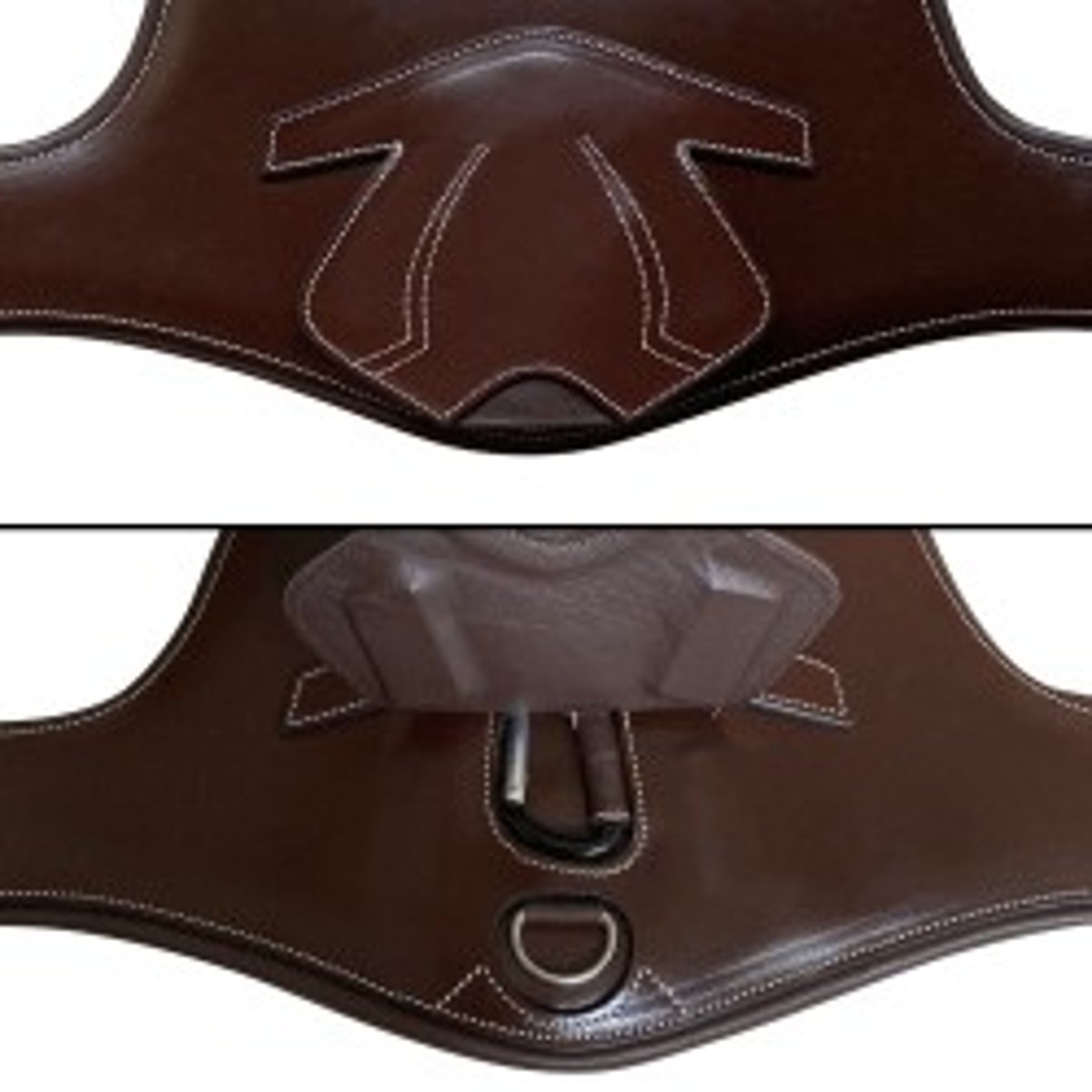 Com costuras brancas contrastantes, a cilha destaca-se pelo acabamento sofisticado. Está equipada com estacas laterais e central para fixação da couraça de 5 pontos, além de um mosquetão central protegido por aba com fecho magnético, que evita atritos indesejados e confere um visual limpo e funcional.