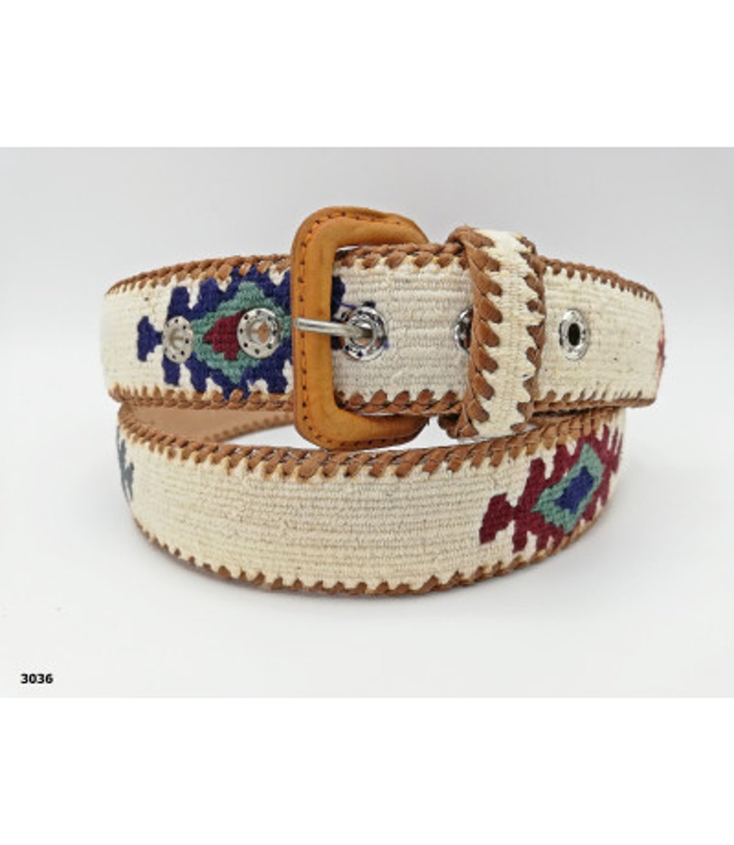 Cinto Naif, tecido à mão em teares com 100% algodão, acabamento em couro bovino, com bordas trançadas à mão e fivela revestida em couro. Cinto étnico.