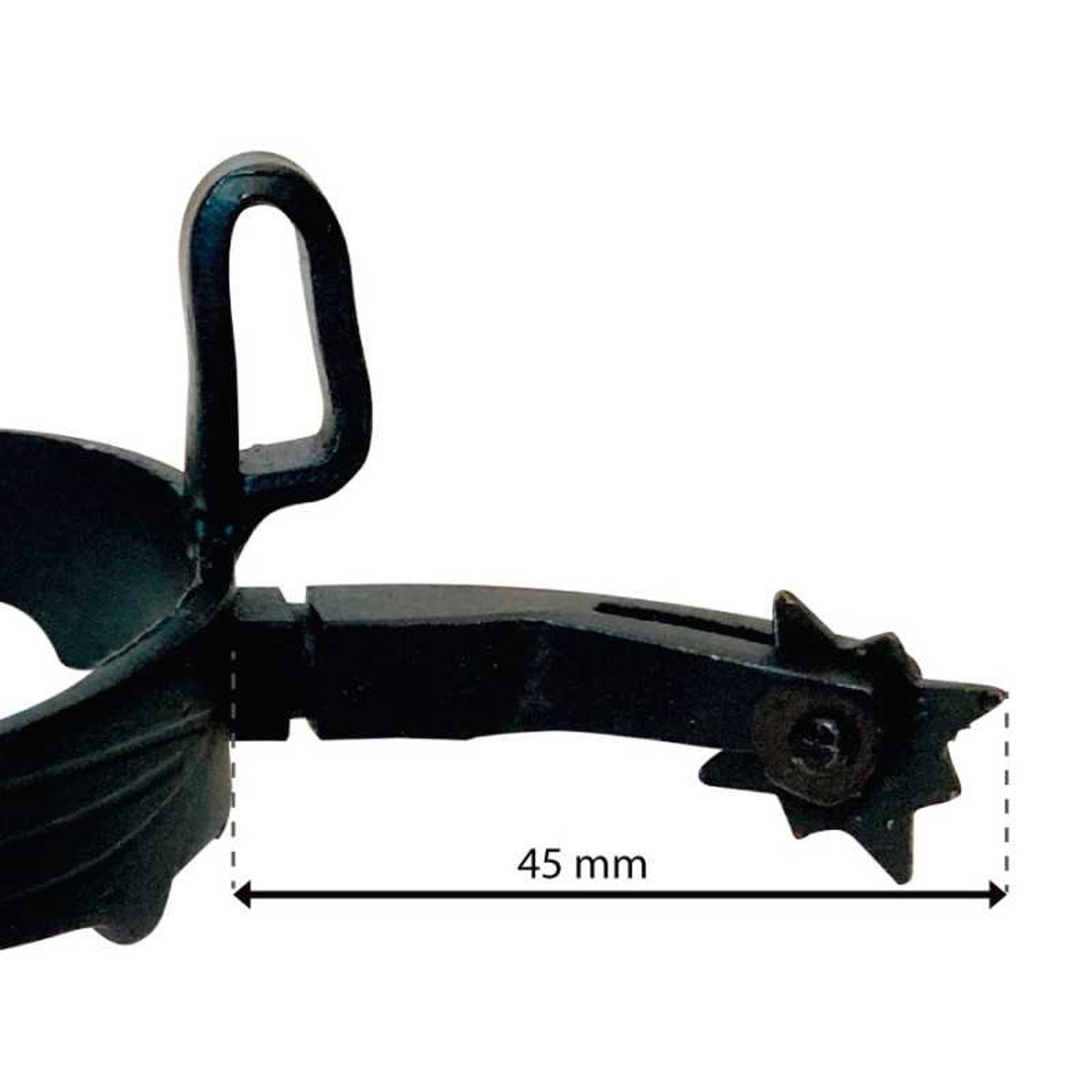 Uma espora econômica usada na equitação tradicional da vaqueira espanhola, com acabamento pavonado e roleta espanhola com estrela de 8 pontas.