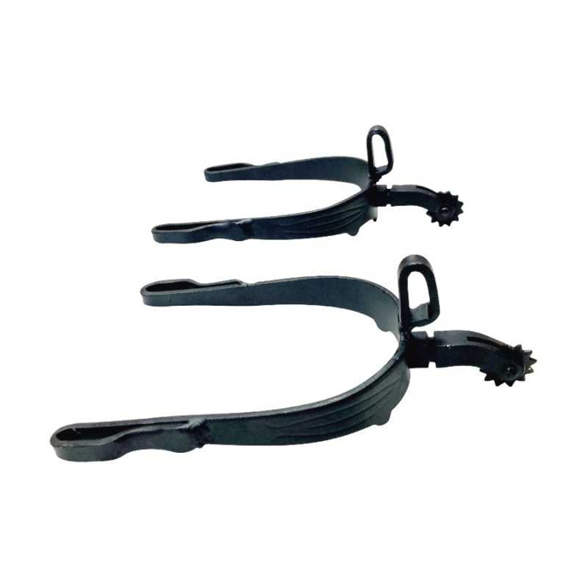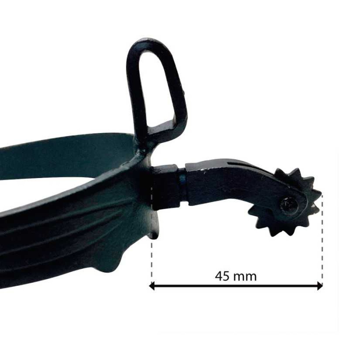 Uma espora usada na equitação tradicional da vaqueira espanhola, com acabamento pavonado e espora vaqueira em forma de estrela de 12 pontas.