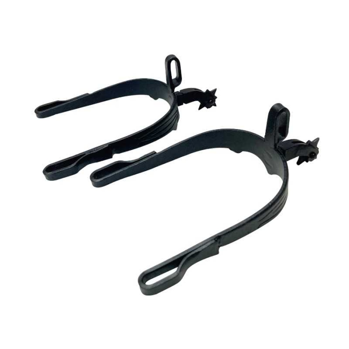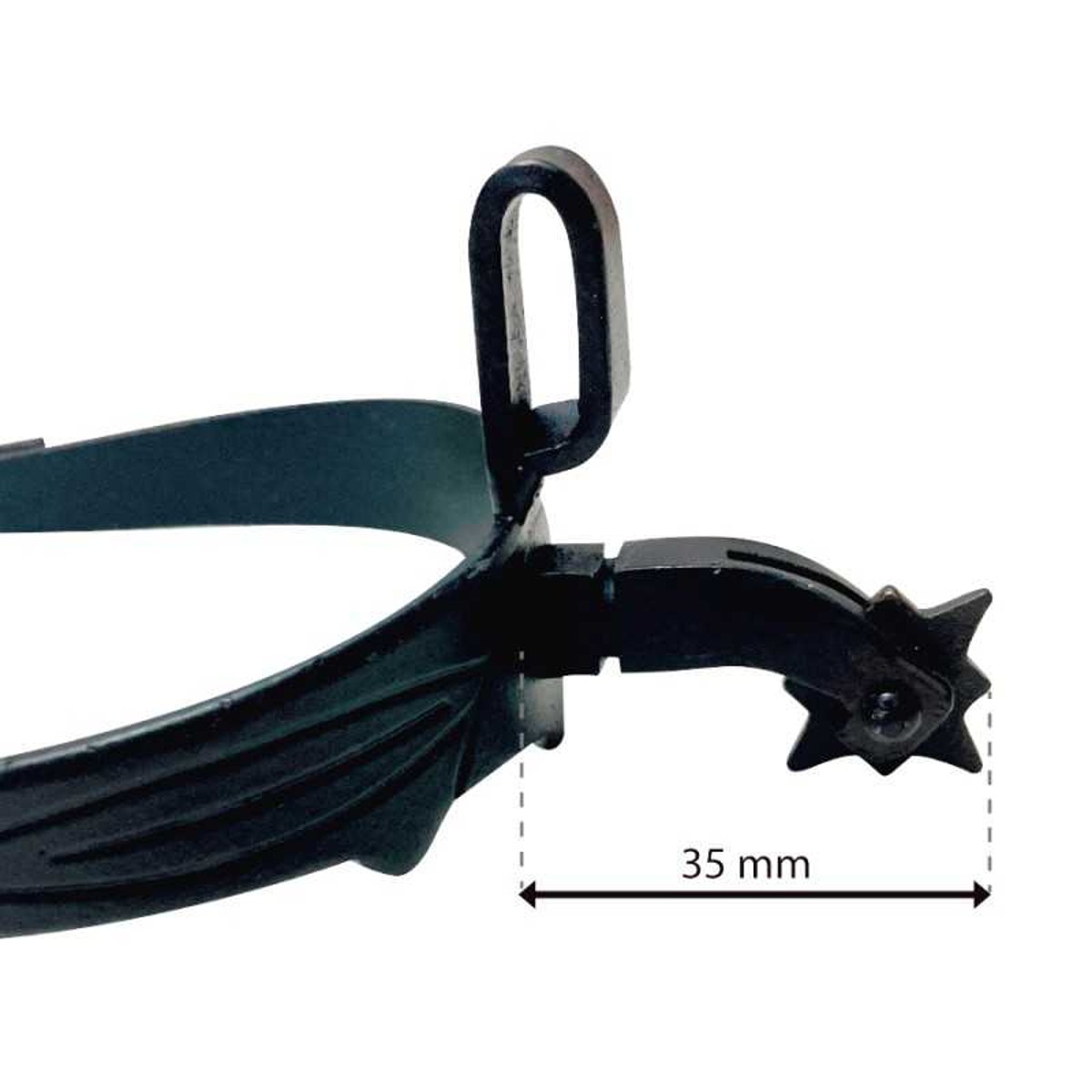 Uma espora usada na equitação tradicional da vaqueira espanhola, com acabamento pavonado e roleta vaqueira com estrela de 8 pontas.