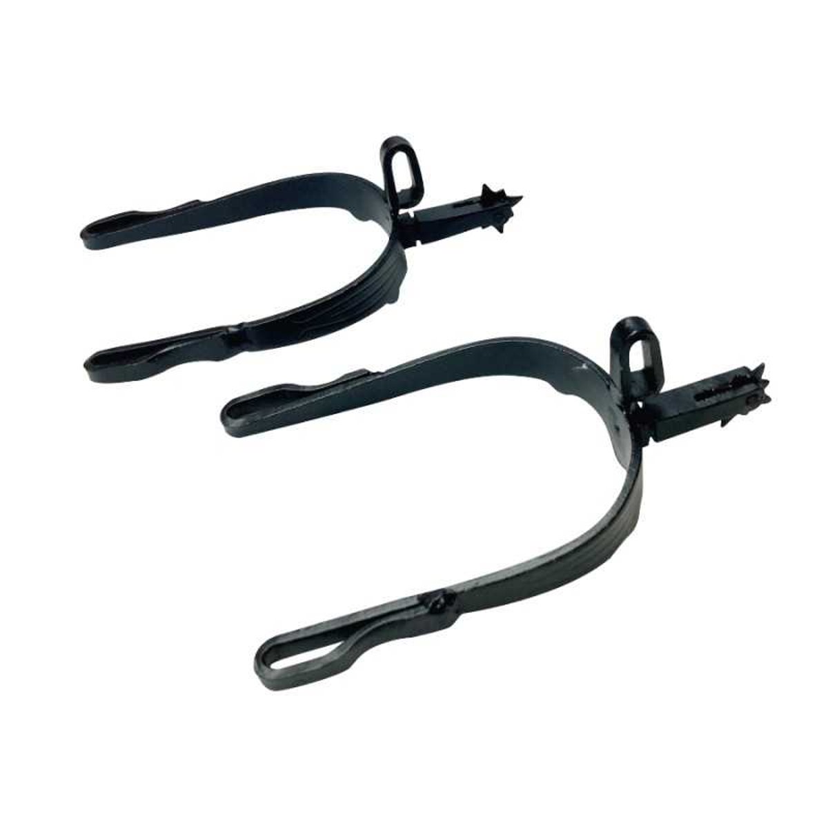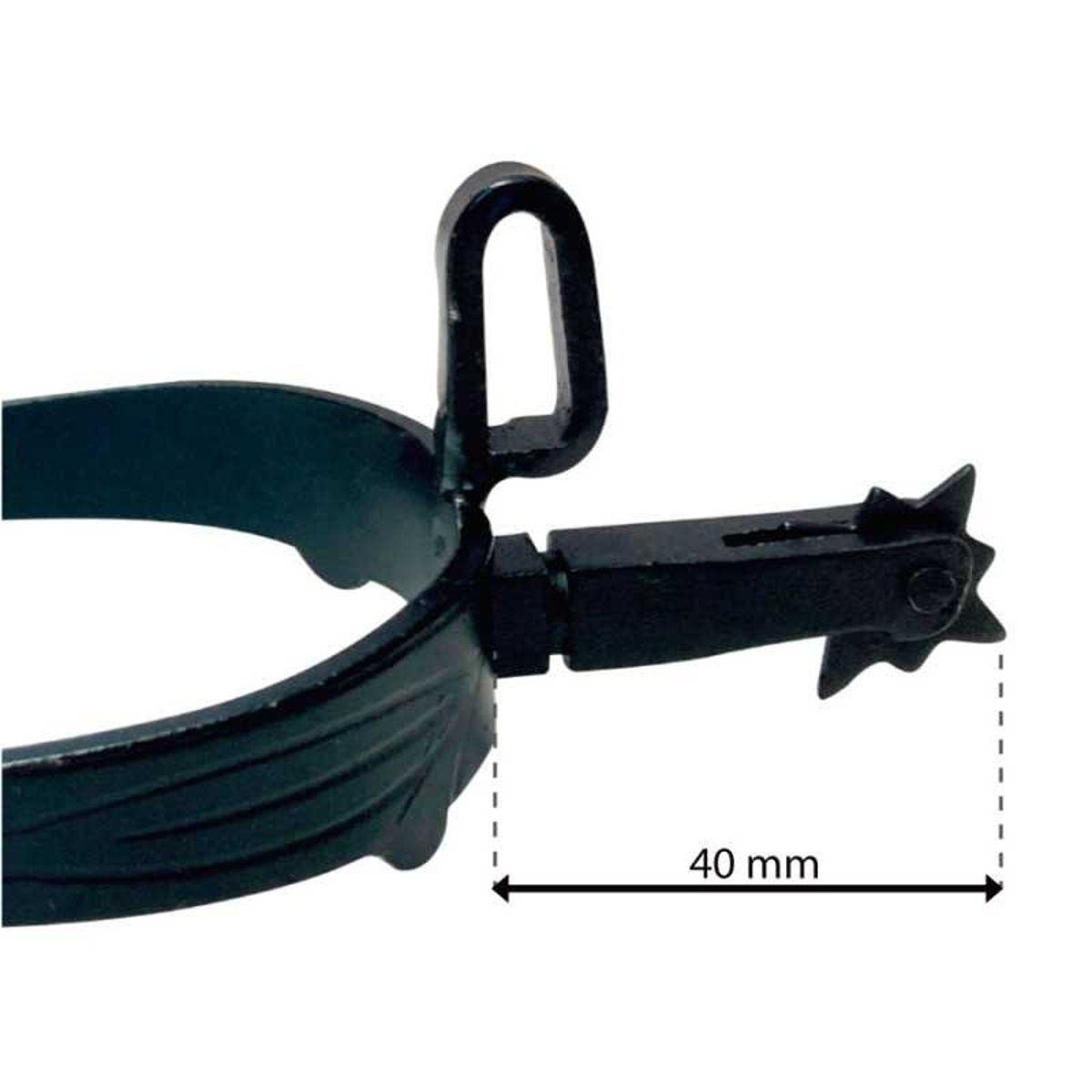 Uma espora usada na equitação tradicional da vaqueira espanhola, com acabamento pavonado e roleta vaqueira com estrela de 8 pontas.