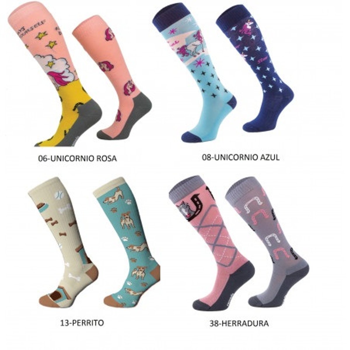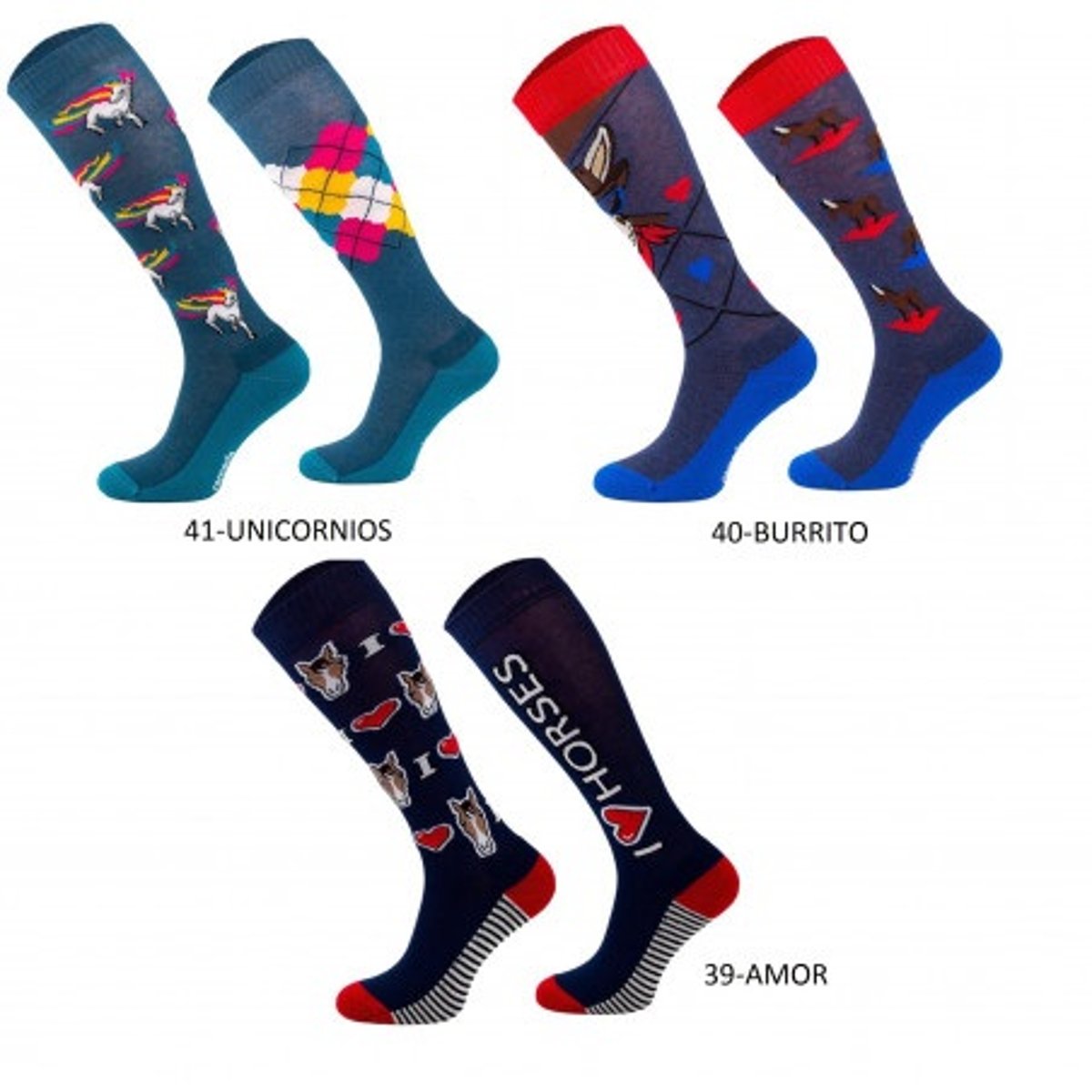 Meias de montaria unissex com um design divertido, adequadas para o verão e o inverno. Composição: 82% algodão, 13% poliamida, 5% elastano.