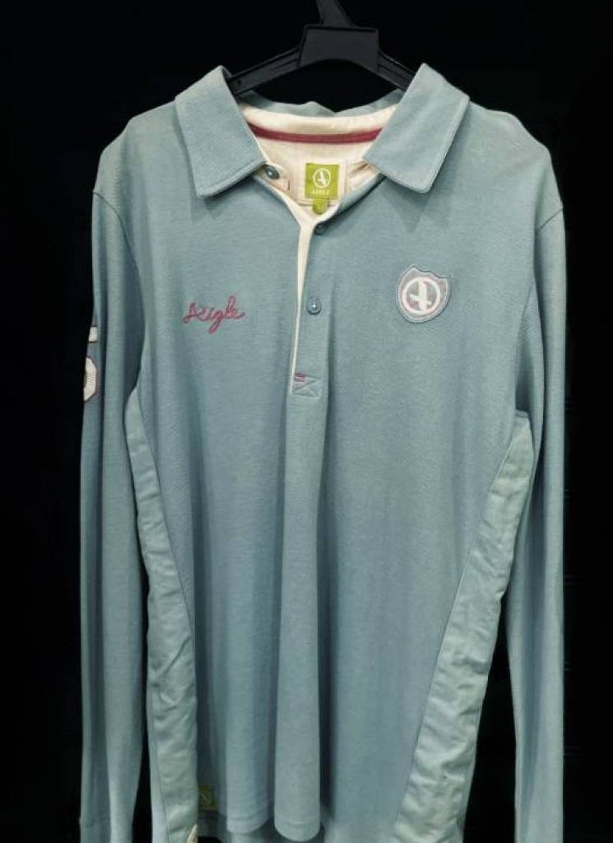 Polo Manga Comprida Srª, azul claro com detalhes em rosa.