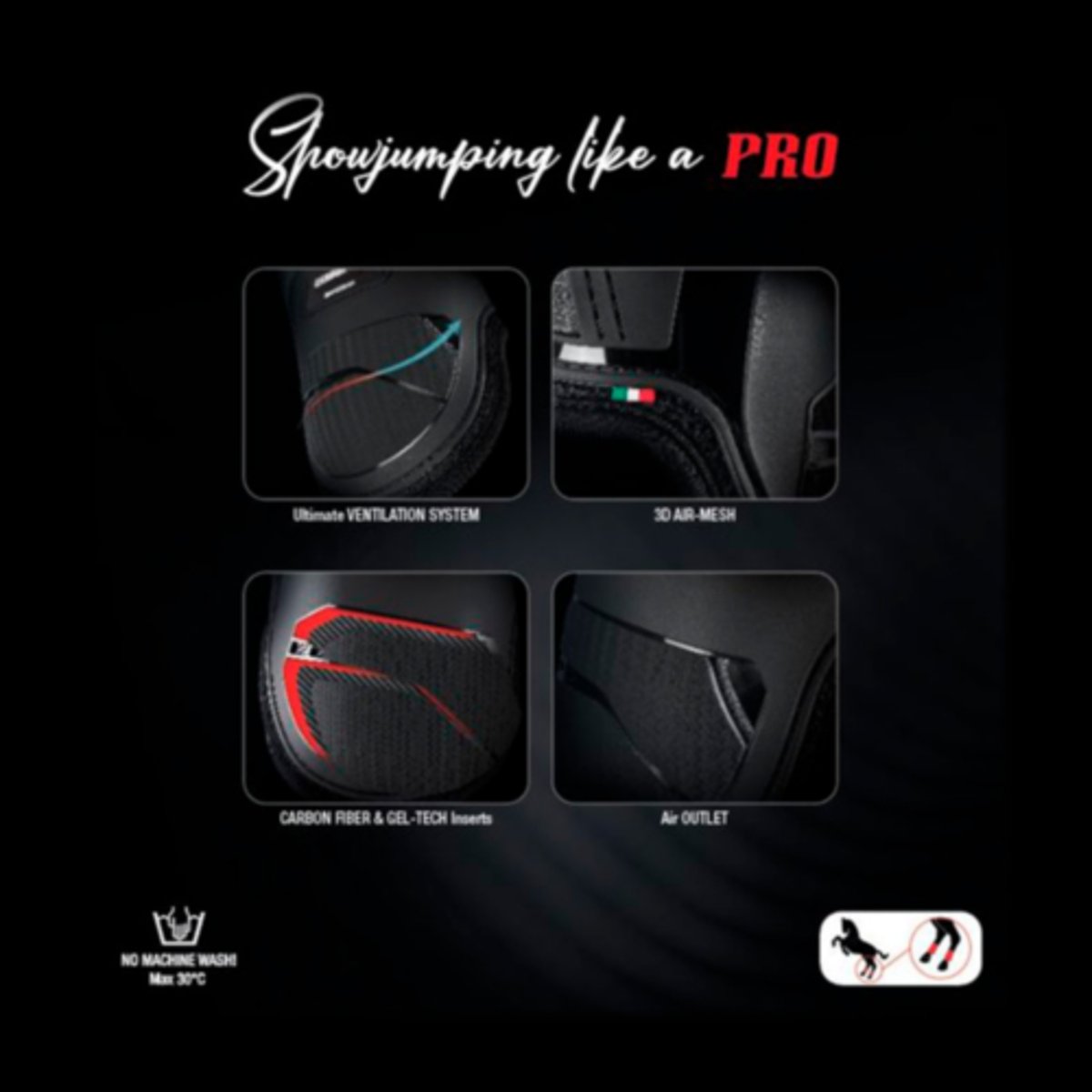 O Protetor de Fetlock CARBON PRO representa a evolução dos nossos protetores de salto mais populares e mais vendidos, agora redesenhados com um design completamente revisado para oferecer ao cavalo protetores ainda mais leves e respiráveis, além de uma área de proteção mais abrangente. Os elementos de fibra de carbono, ainda mais resistentes e extensos, criam uma barreira térmica para proteger as articulações do cavalo do calor gerado pelo atrito e aumentar a resistência ao impacto. O acolchoamento consiste em uma camada externa 3D Air-Mesh, uma camada interna de neoprene perfurado e o comprovado Gel-Tech para as áreas mais expostas a impactos.