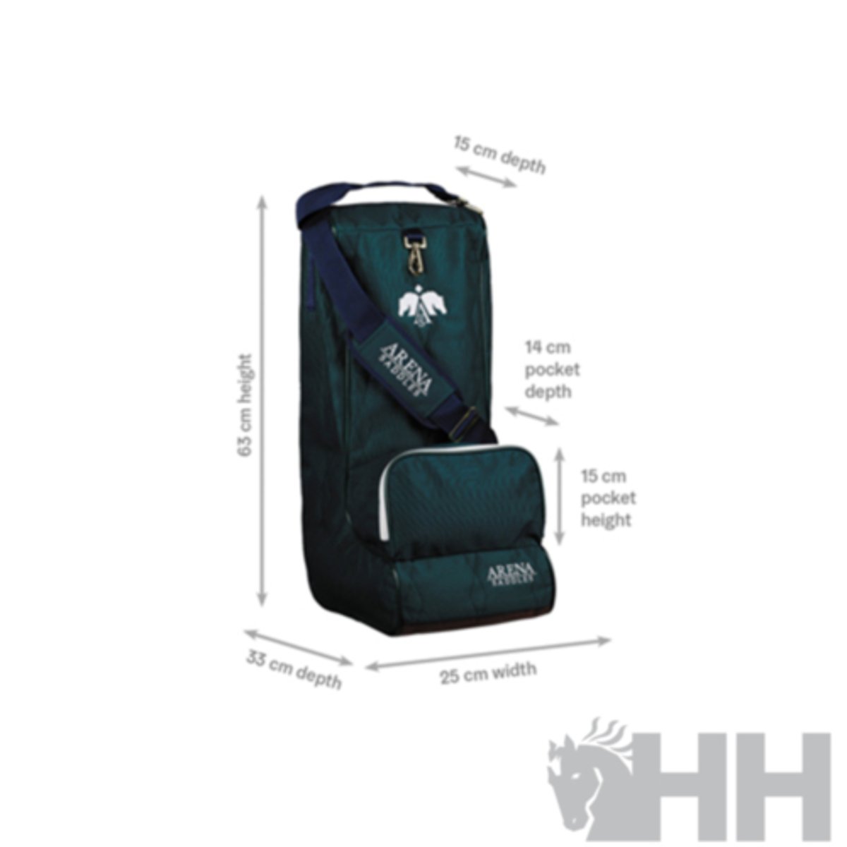 Bolsa acolchoada com base impermeável e muito resistente, além de alça superior removível para facilitar o transporte. Para guardar suas esporas e acessórios de limpeza de botas, a bolsa possui um bolso frontal adicional com zíper, enquanto o clipe extra permite que o cavaleiro prenda outros acessórios, como a bolsa para capacete Arena (vendida separadamente), para um transporte sem esforço.