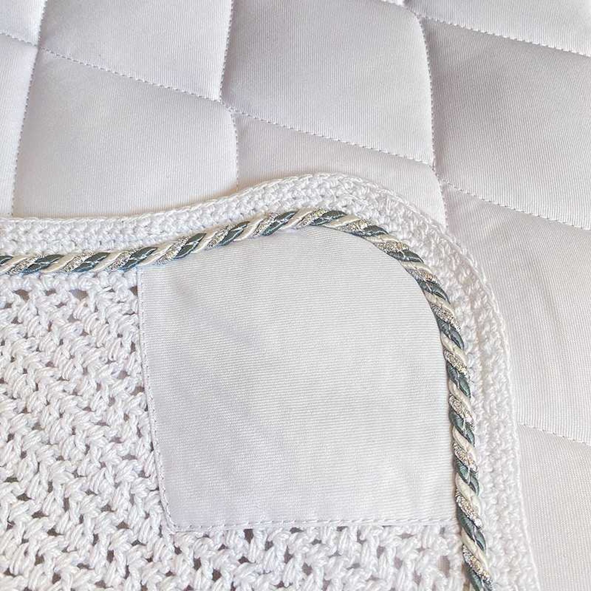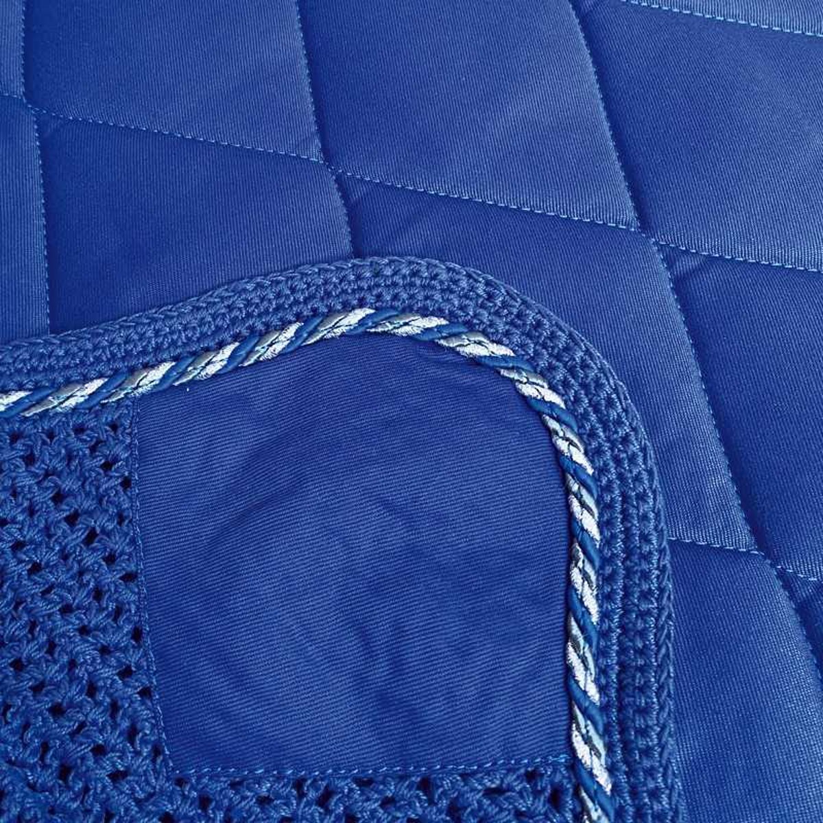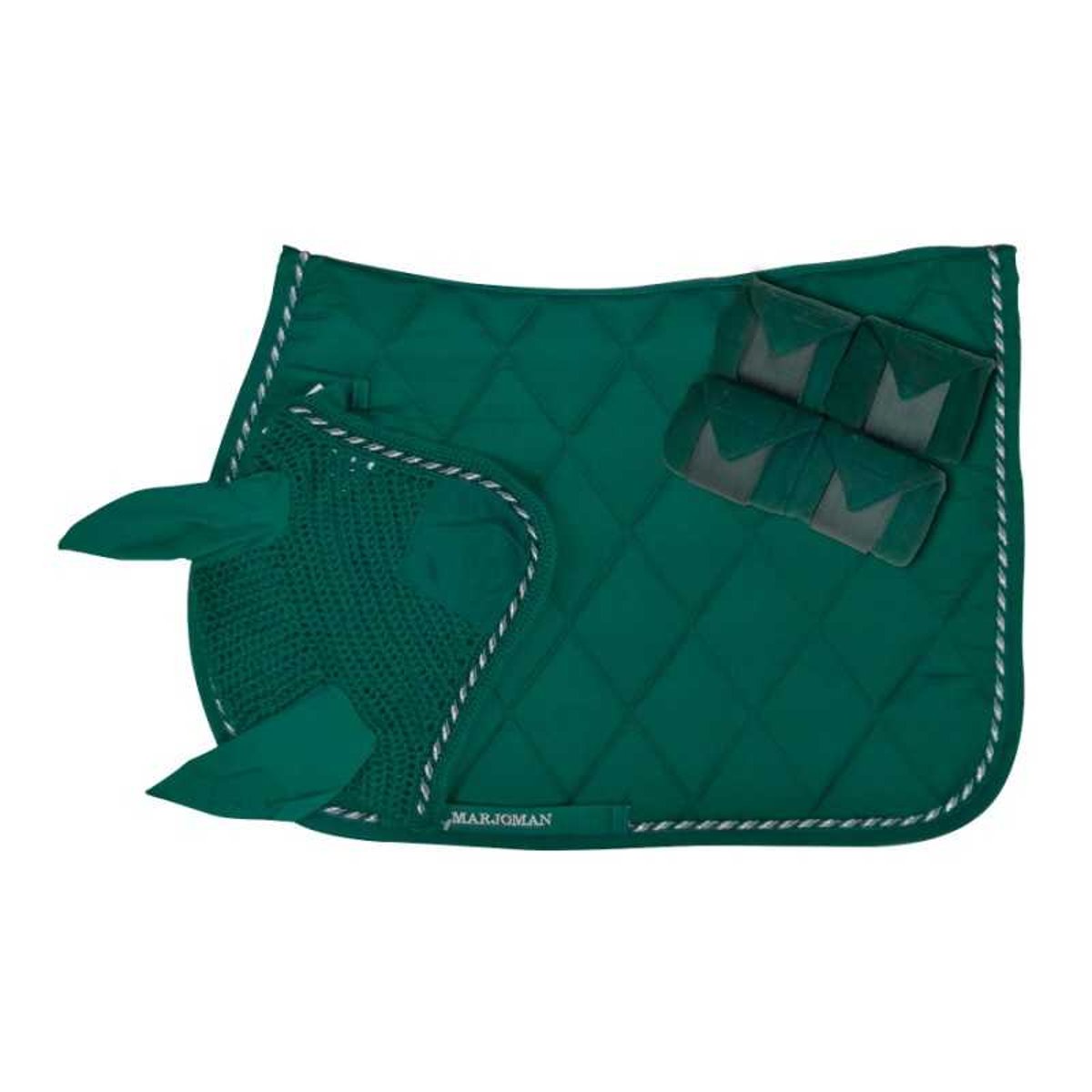 Conjunto de 3 peças composto por suadouro, mosqueiro, ligaduras na mesma cor. Um conjunto perfeito para equipar seu cavalo e garantir que todos os acessórios combinem. O suadouro é acolchoado com um grande padrão de losangos e personalizado com o nome Marjoman. O suadouro e o mosqueiro são finalizados com um lindo cordão tricolor: composto por uma combinação de branco, prata e cordão na mesma cor do suadouro.