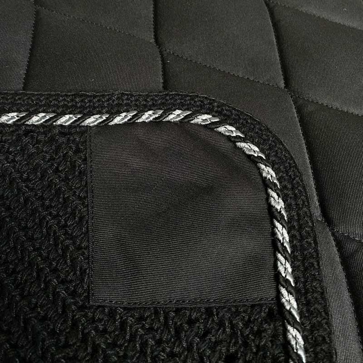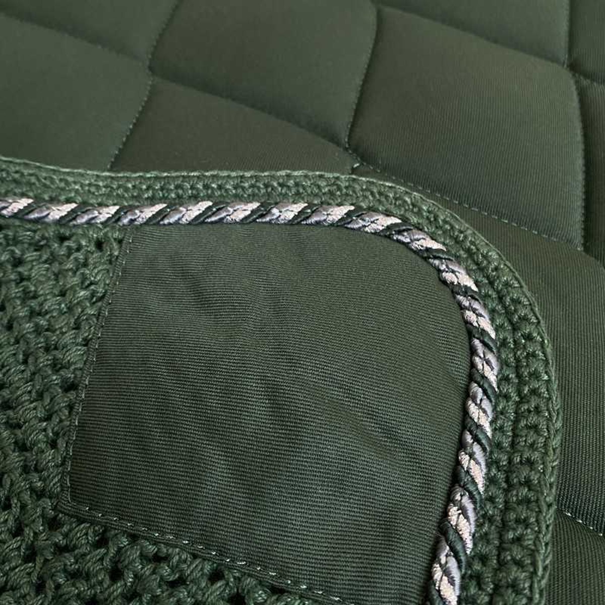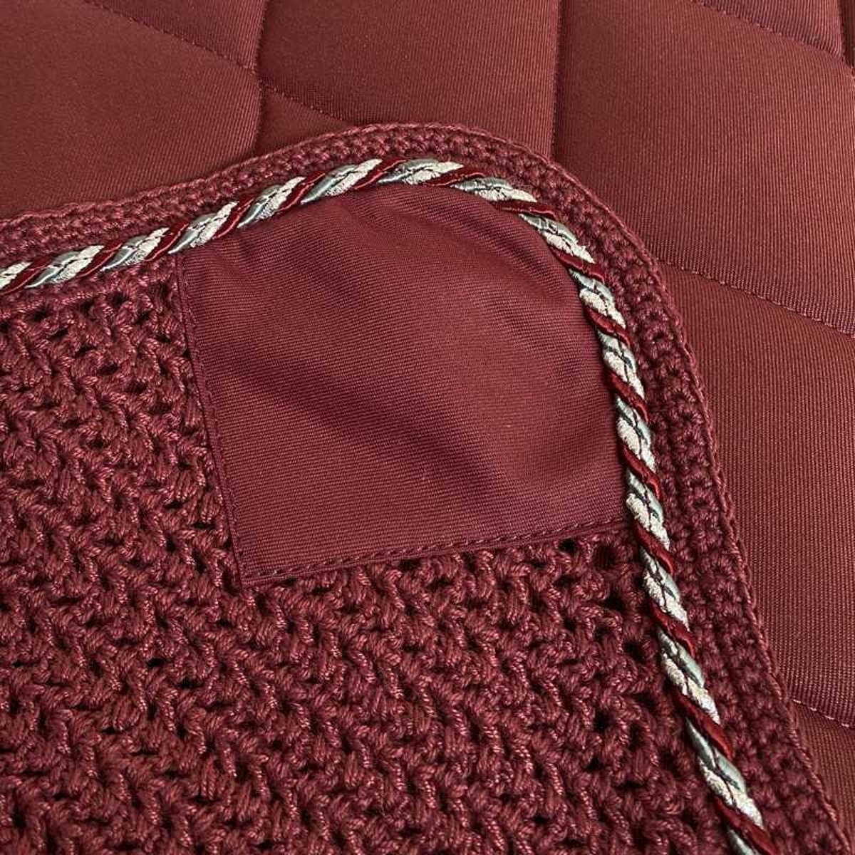 Conjunto de 3 peças composto por suadouro, mosqueiro, ligaduras na mesma cor. Um conjunto perfeito para equipar seu cavalo e garantir que todos os acessórios combinem. O suadouro é acolchoado com um grande padrão de losangos e personalizado com o nome Marjoman. O suadouro e o mosqueiro são finalizados com um lindo cordão tricolor: composto por uma combinação de branco, prata e cordão na mesma cor do suadouro.