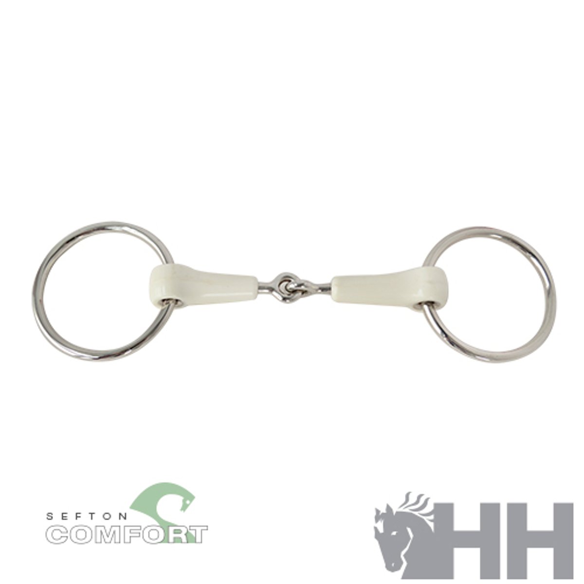 A embocadura é feito de um material termoplástico de alta qualidade que estimula a mastigação, proporcionando um encaixe confortável. Esse contato preciso e refinado com a boca do cavalo resulta em conforto excepcional e promove um alto nível de prontidão para o desempenho. O núcleo interno da embocadura é feito de aço inoxidável.