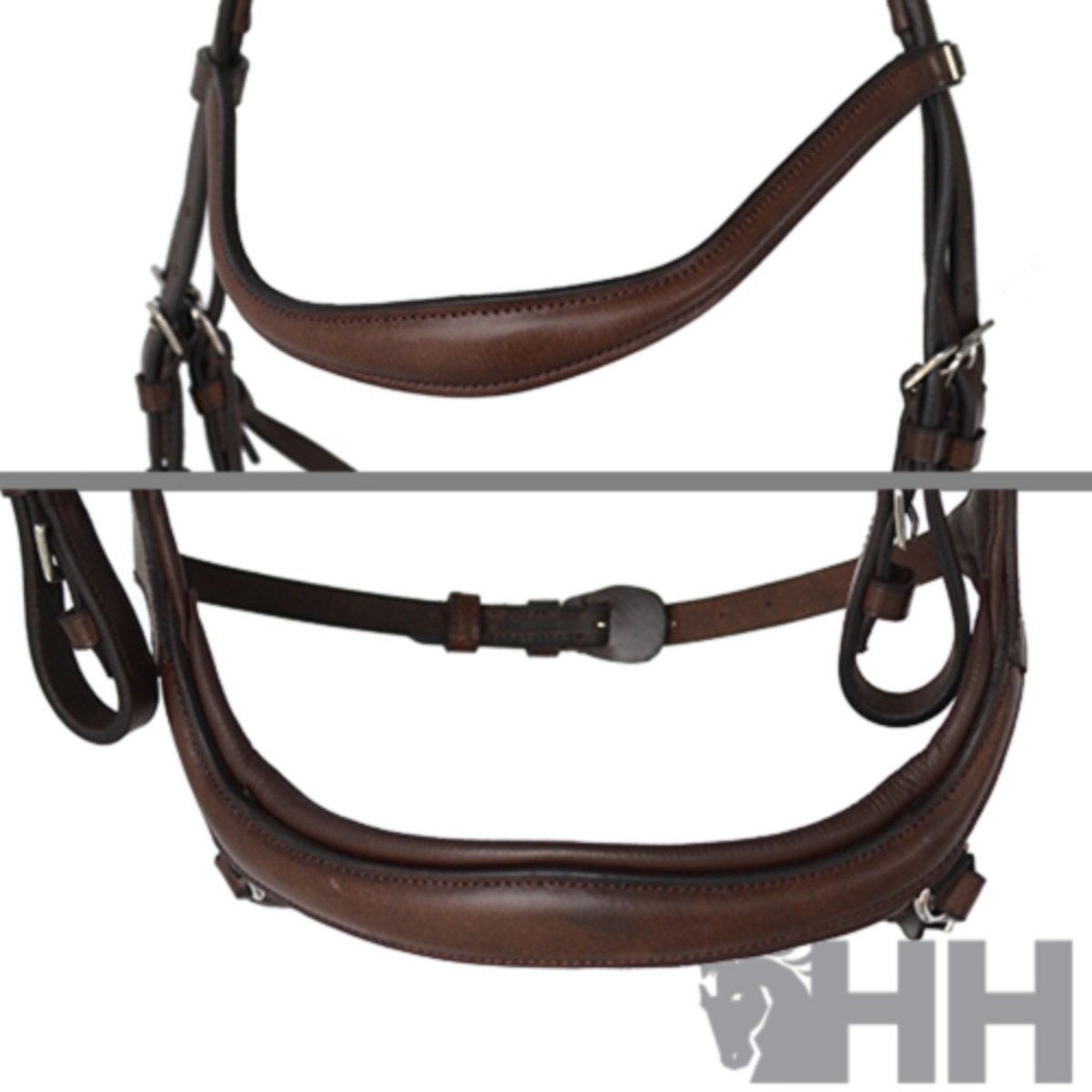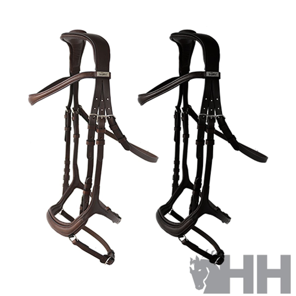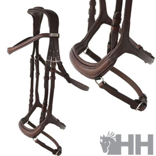 Cabeçada de competição contemporâneo com cabeça, testeira e focinheira anatômicos. A cabeça, além de seu design anatômico, é fortemente acolchoada para proporcionar conforto superior ao pescoço do cavalo. A focinheira, também anatômica, foi projetada para se apoiar nos ossos da cabeça do cavalo e, assim como a cabeça, oferece o máximo conforto ao cavalo. Feito com couro premium.