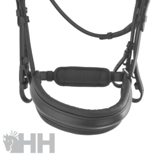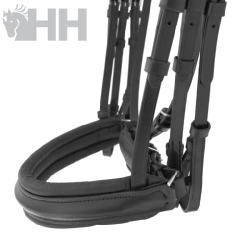 Detalhes técnicos: - Cabeceira acolchoada e com formato anatômico. - Focinheira larga e resistente à pressão. - Testa lateral elástica para melhor ajuste do freio ou do bridão. - Coleira estranguladora removível com mosquetões.