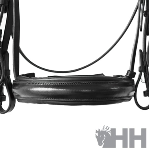Cabeçada e suporte para bridão em couro premium com fivelas de aço inoxidável. Focinheira acolchoada extra larga (5 cm de largura na parte interna) e cabeça acolchoada. Fechamento da focinheira em duas peças com acolchoamento e correia de aperto.