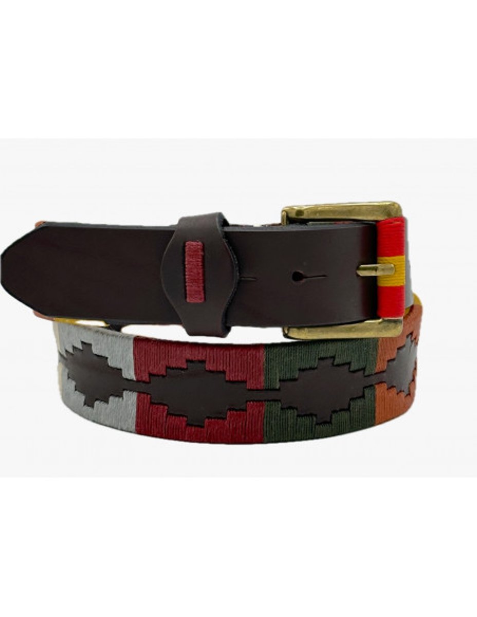 Cinto argentino bordado, confeccionado em couro marrom de alta qualidade. Fivela dourada fosca a cor não desbota com o tempo. Decorado com vibrantes padrões de losangos argentinos. 100% feito à mão.