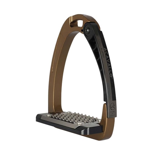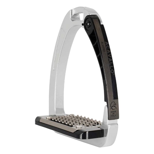 Estribo de segurança ALUPRO de nova geração para adultos. Combinação de materiais metálicos e poliamida: O arco do estribo é feito de alumínio, enquanto o braço de abertura é feito de um material especial de poliamida.